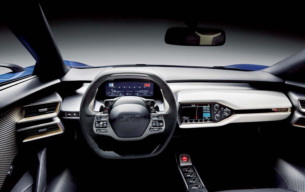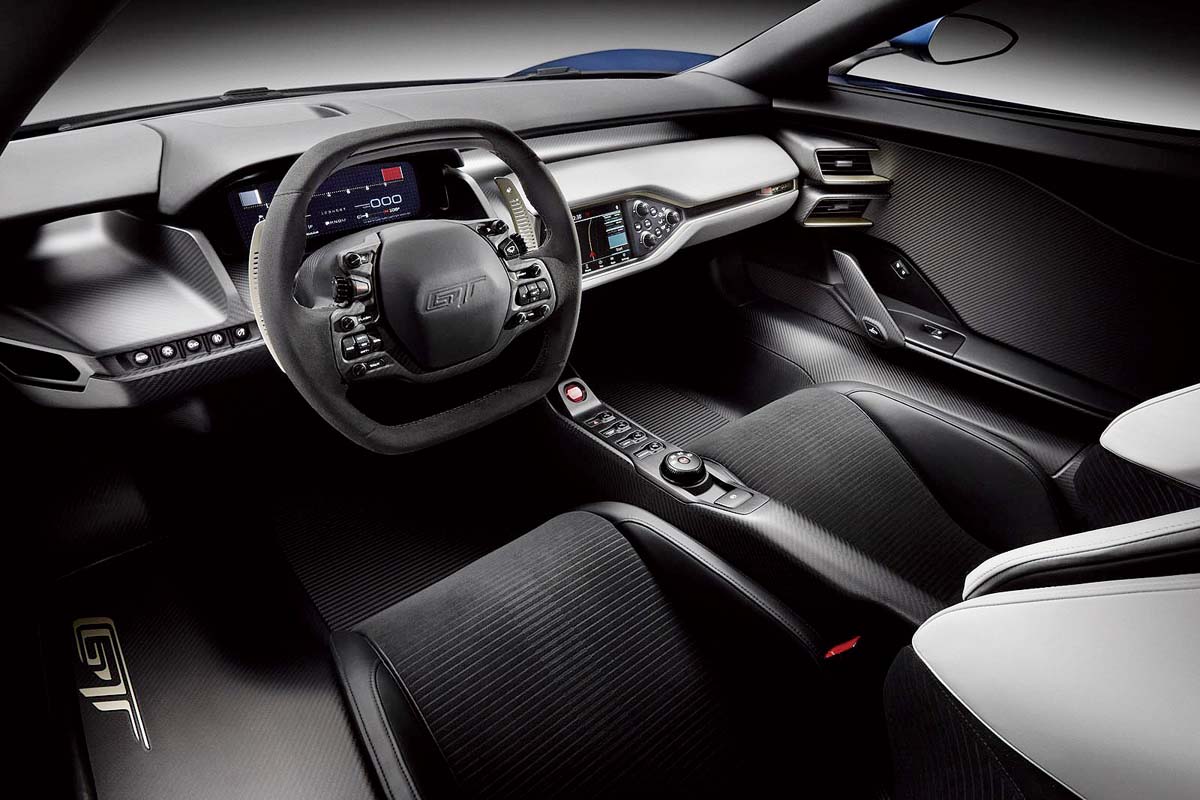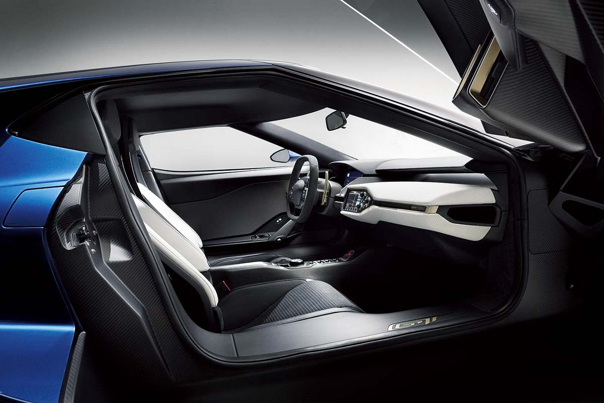 外觀方面,新一代GT採用大量折線及空力進氣口,營造出類似當代主流超跑的肌肉感。頭燈以雷射大燈科技構成,車頭下方為大型蜂巢狀水箱護罩,而上方則有2個大出風口,並於車側設計了提供中置引擎氣流的大型進氣口。同時,尾燈則以雙圓燈來鋪陳。輪圈搭載20吋鋁合金規格,並搭配了Michelin Pilot Super Sport Cup 2輪胎,以及Brembo碳纖維陶瓷複合煞車碟盤。另外,車門則為上開式設計。碳纖維車艙內有兩張賽車座椅,並有F1風格的多功能方向盤搭配液晶儀錶板。Ford原廠也為此車配備了SYNC 3多媒體資訊娛樂系統,同時採用QNX平台。雖然要到2016年底才正式量產,不過目前Ford已與Xbox One合作,讓新款GT提前在賽車遊戲Forza Motorsport 6中,與Shelby GT350 Mustang及F-150 Raptor同時登場。等不及的車迷可先享受駕馭虛擬Ford GT的感受。