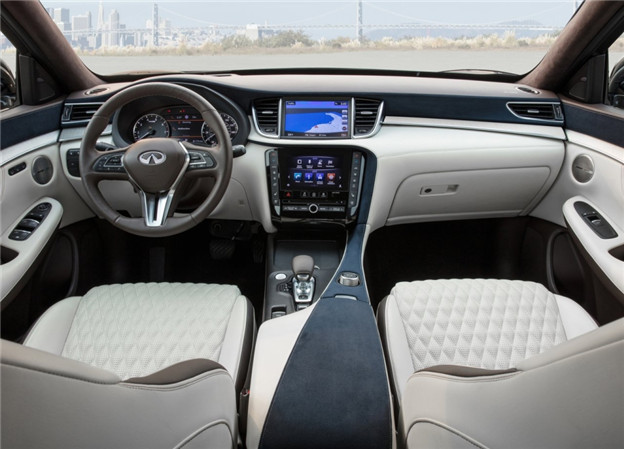 至於內裝部分,則與現行 Q50、Q60 有著極高相似度,中控台 7 吋、8 吋雙觸控螢幕的佈局顯示豐富行車訊息,且還有投射面積達 9 吋的 HUD 抬頭顯示器提供最直覺的資訊,且配置 BOSE 音響帶來出色影音效果。而菱格紋座椅與雙色皮質內裝預料會帶來不俗的車室質感,另外將後排座椅傾倒後可得到 1,832L 的優異容量,使用機能性不俗。