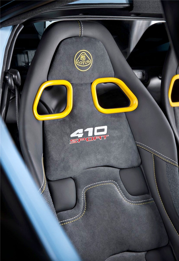 內裝則維持品牌一貫作風,沒有任何多餘配件,除了輕量化外更讓駕駛專心享受純粹駕馭樂趣。而 Exige Sport 410 除了內裝擁有四種顏色的皮革、Alcantara 麂皮可選擇外,還有車用滅火器、電源阻斷器、無安全氣囊方向盤、防滾籠、4點式安全帶,以及可減輕10kg的全段鈦合金排氣管等「賽道配備」提供為選配項目,就算在一般道路駕駛也是令人熱血萬分。