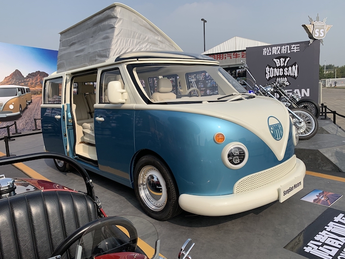 同時,還發佈了採用相同動力總成的一款MPV概念車,採用了類似大眾T1的復古設計,雙色車身、圓形大燈以及鍍鉻凸面輪圈是為了復刻大眾T1的經典元素。整車還配備了雙側滑門。車尾來看,對開尾門和後掛式備胎是這款MPV的一大特色,獨立後保險槓在視覺上同樣復古甚是吸引。