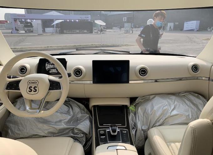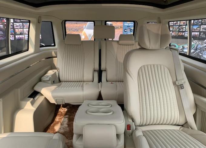 內飾部分來看,新車內飾造型非常豪華,座艙內使用了大量的皮革材質,儀錶盤和中控屏均為全液晶形式。車內座椅為2+3+2的佈局形式,第二排電動座椅可360度選裝,第二排中間椅背可放平形成一個小茶几使用。